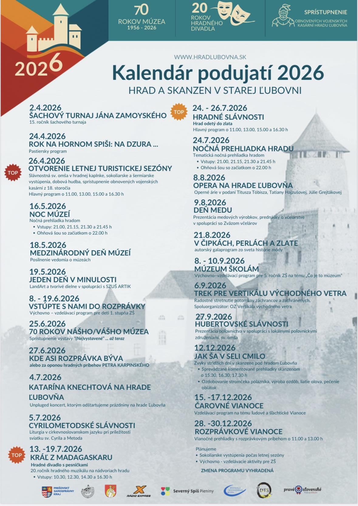 Hrad a skanzen v Starej Ľubovni - kalendár podujatí 2026